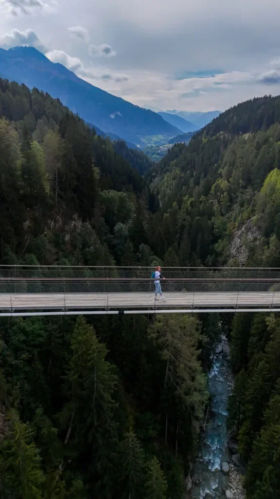 Przejdź jednym z najdłuższych wiszących mostów w Alpach. Dojście piesze to przygoda sama w sobie – surowa dolina, ścieżka wśród skał i spektakularne widoki.