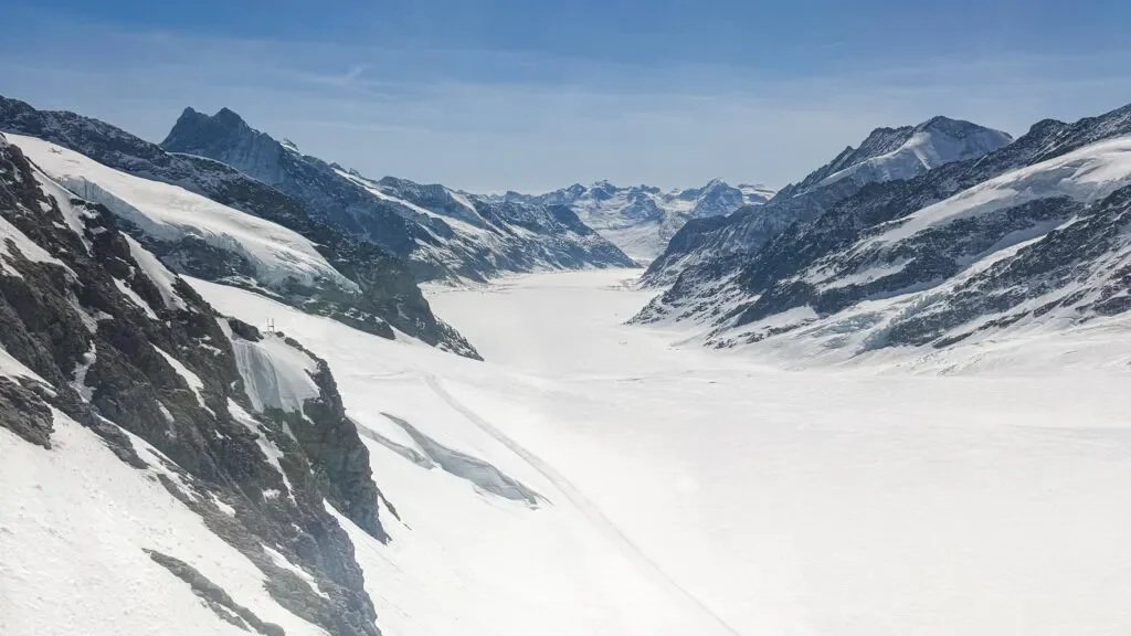 Platforma z panoramicznym widokiem na Alpy, w tym na największy lodowiec w Alpach – Aletschgletscher. Taras jest dwupoziomowy, a widok z jego górnej części dosłownie zapiera dech w piersiach. Bardzo mocno tam wieje, więc koniecznie zabierz czapkę i osłonę na szyję. Co ciekawe, mimo ogromnej wysokości, często można tam zobaczyć ptaki szybujące tuż obok platformy, co dodaje magii temu miejscu. W pogodny dzień widać aż po granice Francji i Włoch.